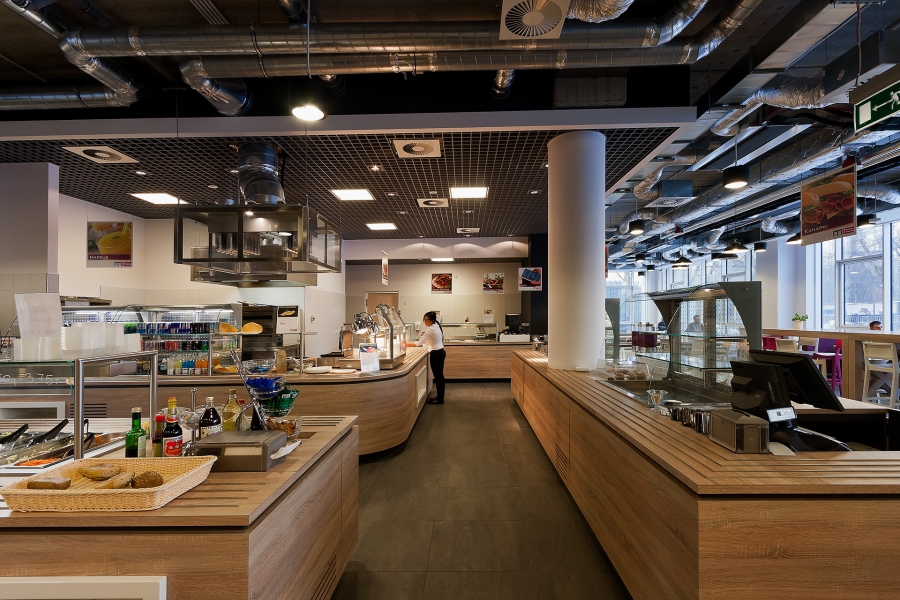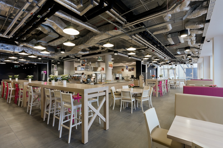 Bardzo ciekawym wyzwaniem był projekt kantyny dla siedziby głównej T-Mobile na Warszawskim Służewcu. Na powierzchni (ok. 600 m2) zmieszczono kuchnię z magazynami i powierzchnią do obsługi dużych zamówień cateringowych oraz salę konsumpcyjną dla pracowników firmy i gości. Główne założenia projektu to: otwarcie przestrzeni; zróżnicowanie stref spełniających określone funkcje; zapewnienie warunków do mini spotkań podczas obiadów z zachowaniem stylistyki zgodnej z trendami dostosowanej do marki T-Mobile. Całość miała być przytulna i prosta w realizacji. Efektem tych założeń jest duże zróżnicowanie dostępnych miejsc pod względem wielkości (miejsca jedno, dwu, cztero, sześcio, ośmio i kilkunastoosobowe), pod względem klimatów (common table, stoliki pod ścianami, ławy w stylu american diners, ławki w stylu ogrodowym czy wreszcie stoły okrągłe („domowe”). Aby zachować spójność stylistyczną przy tak dużej różnorodności form siedzenia, projektanci ujednolicili charakter sufitu – przeciągnęli pas lamp wzdłuż całej sali.