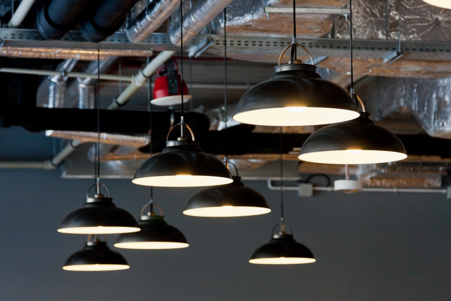 Sufit wymagał zaprojektowania tras kablowych i układu kanałów wentylacyjnych, co wydawało się trudnym zadaniem z uwagi na ilość urządzeń i instalacji (własnych i tranzytowych) oraz konieczność wkomponowania w nią różnego rodzaju oświetlenia. Po wielu konsultacjach z branżystami udało się zaproponować ciekawy układ tras dla wszelkiego rodzaju mediów. Odkrycie sufitu pomogło polepszyć parametry akustyczne i estetyczne lokalu a przy tym zwiększyło kubaturę wnętrza, co ma wpływ na komfort użytkowników i wydajność instalacji klima-went.